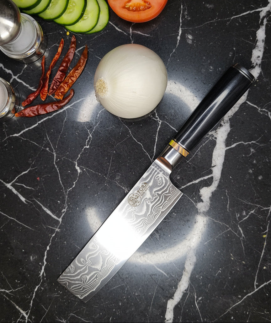 5. 7″ Nakiri Knife – Straight-bladed Japanese vegetable cleaver crafted for clean, fast chopping of greens and produce.