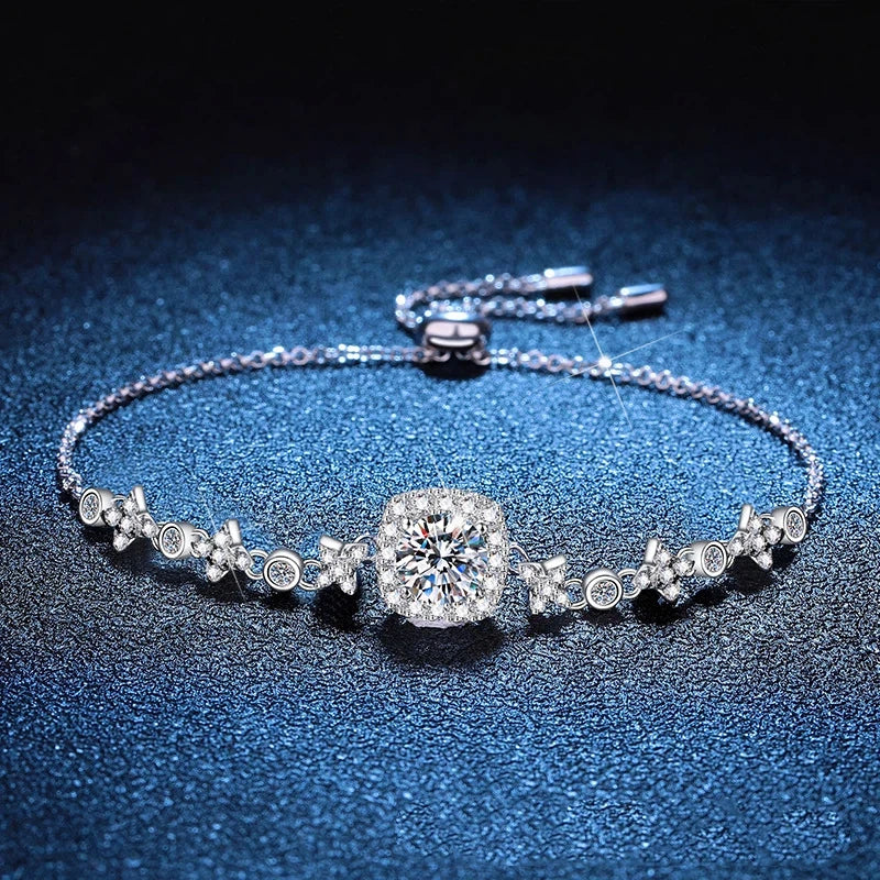 At the heart of the bracelet rests a precision-cut one-carat moissanite, selected for its exceptional fire, clarity, and diamond-like brilliance. The square halo-inspired silhouette enhances light reflection, creating a radiant focal point that draws the eye without excess.