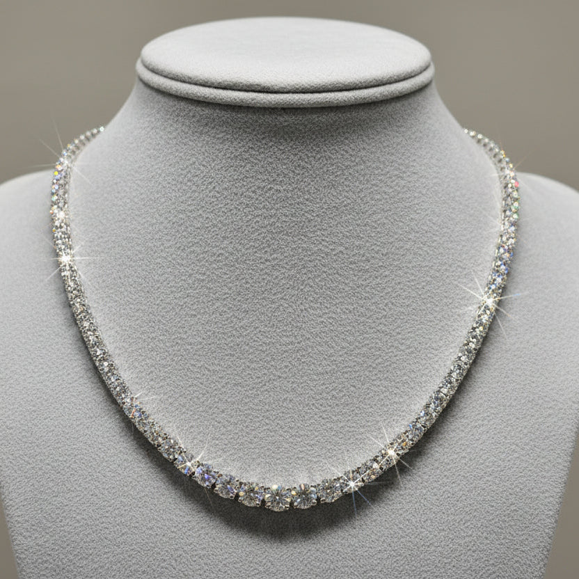 This necklace features a seamless 3mm–5mm size gradient of round-cut moissanite stones, carefully arranged to create depth, flow, and visual harmony. Each stone is graded D color, VVS1 clarity, and Excellent cut, producing exceptional fire and diamond-like sparkle from every angle.